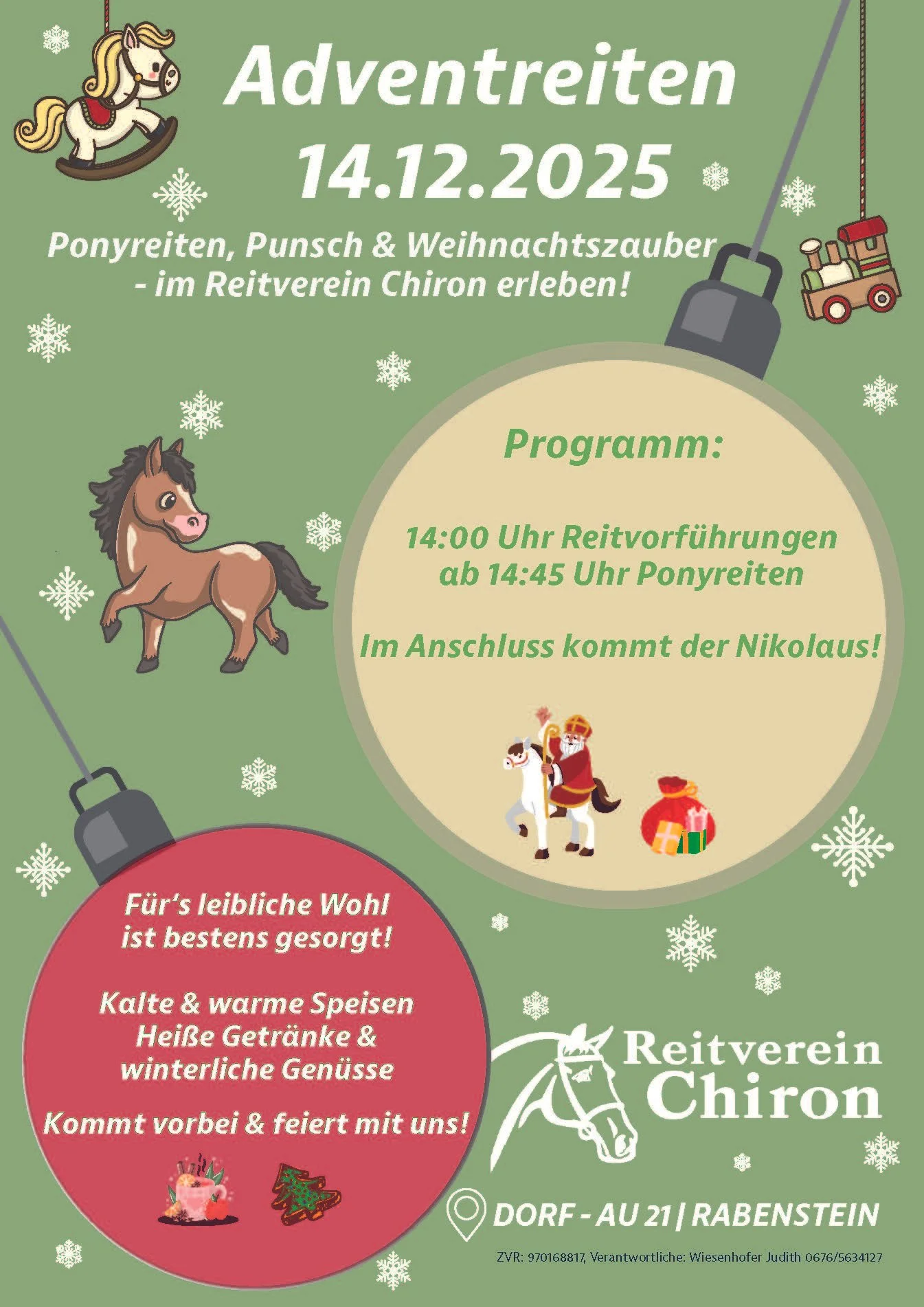 Dez. 14 2:00 PM14:00 Adventreiten 14.12.2025 Sonntag, 14. Dezember 2025 2:00 PM 7:00 PM 14:00 19:00 Reitverein Chiron (Karte) Google Kalender ICS Veranstaltung ansehen →